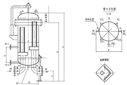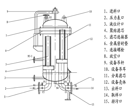 液一液聚结分离器是一个内部装有两组不同功能的滤芯,外部装有液位计、压差计、放气阀、排污(放水)阀、在线取样接头等附件的金属壳体。液一液聚结分离器的基本结构如下图: