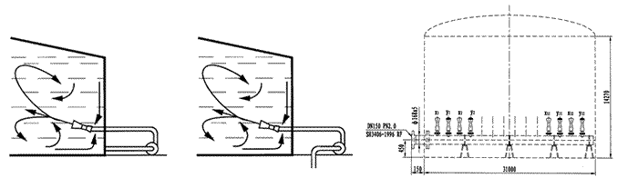 PSG系列罐用喷射式混合器适用范围广阔,作为一个依据,可以说,只要用离心泵可以传送翻转液体,就可以用这种混合器。主要用于容器、贮存罐和中和池,如油品调合,酸碱中和反应等工艺,实为理想的混合设备。 PSG系列罐用喷射式混合器,在大型贮存罐中的作用尤为显著,其安装方位如图所示。